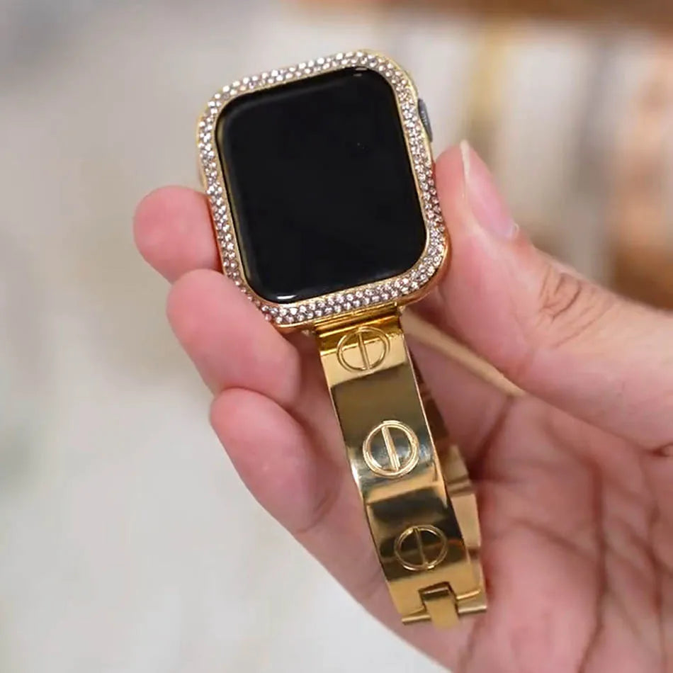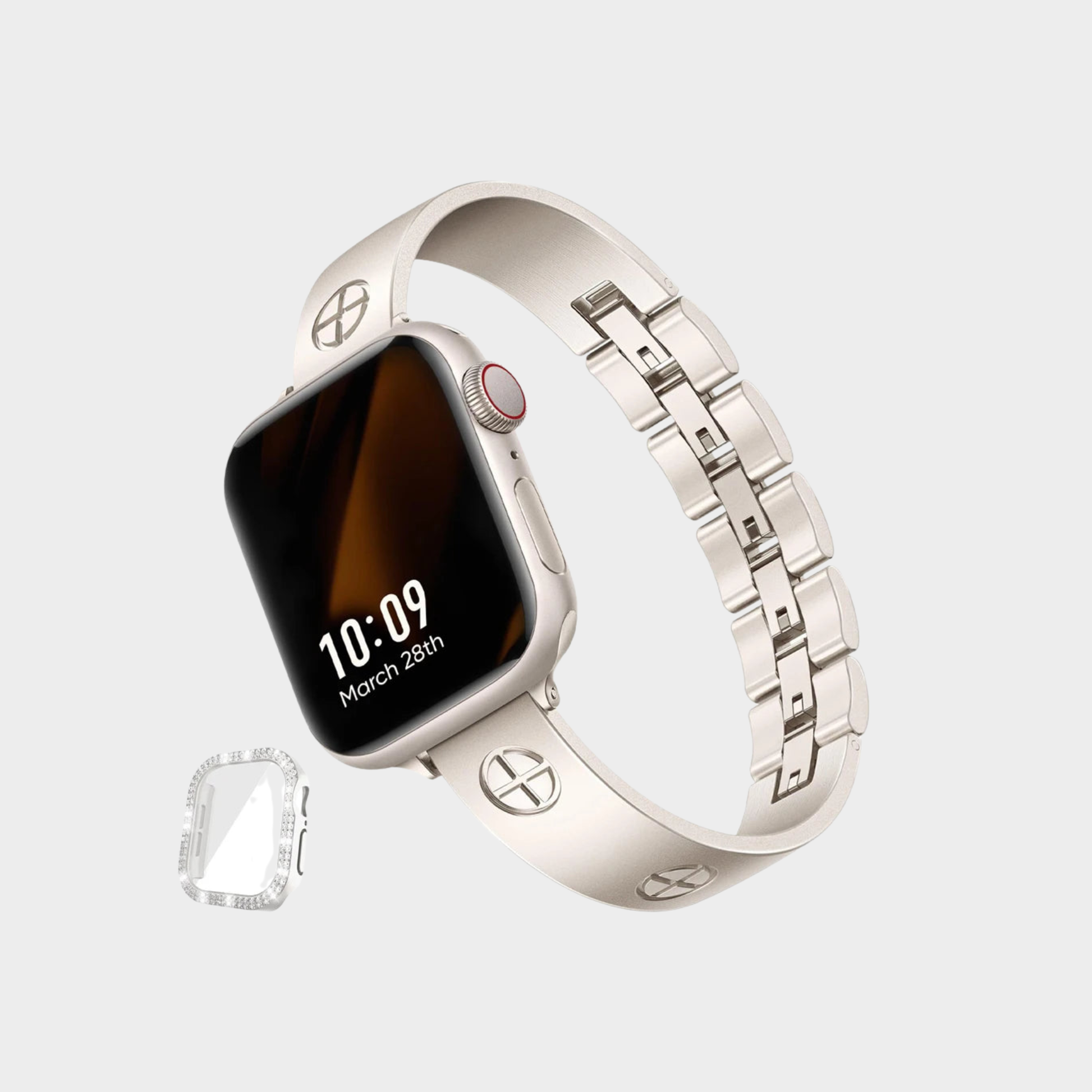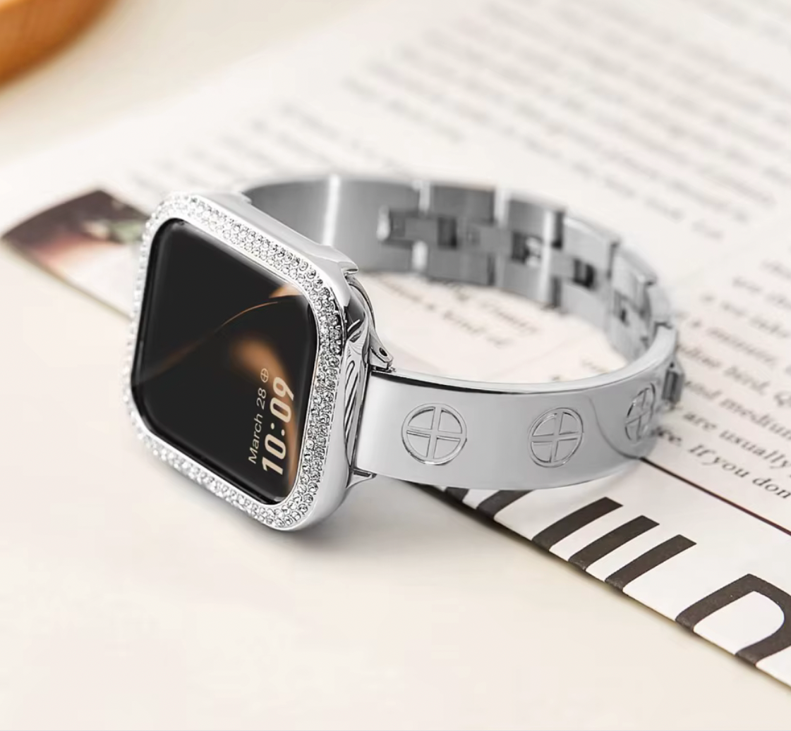includes a protective Apple Watch case adorned with subtle diamond-like details, allowing you to personalize your look from day to night.